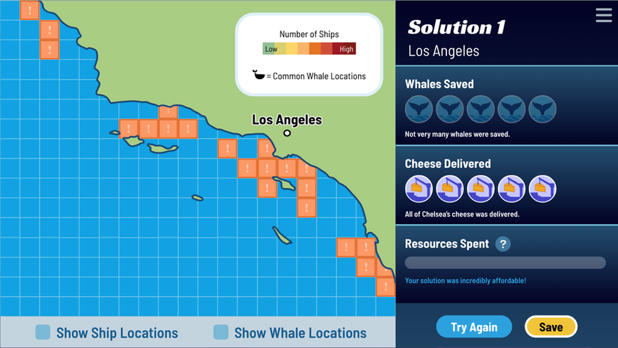 Players are presented with a gridded map where they mark tiles as "slow zone", "no-go zone", and then adjust a scale for "invest in whale reporting". These 3 variables decrease the chance of a whale collision. However, the trade-off is the impact to shipping if a player places tiles too close to ports. Players must decide and find a happy balance between the two. Once the player inputs their selections, they can run the simulation to see the results.