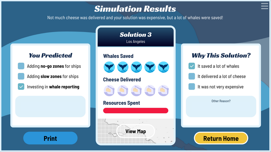 Our team collaborated with our client to create comprehensive computational thinking for students in Grades 3-5. We developed an engaging game that enables children to run numerous simulations, aiming to mitigate the hazards associated with shipping activities and their impact on whales. Throughout the lesson, students were introduced to a wide range of tools currently utilized in the field and were encouraged to evaluate the effects on both whale populations and the shipping industry in order to arrive at an optimal solution.